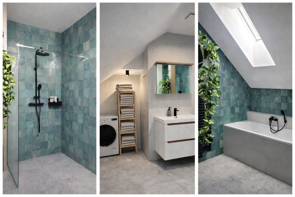 Koupelna, která je inspirována barvami džungle a splňuje požadavky pětičlenné domácnosti.
