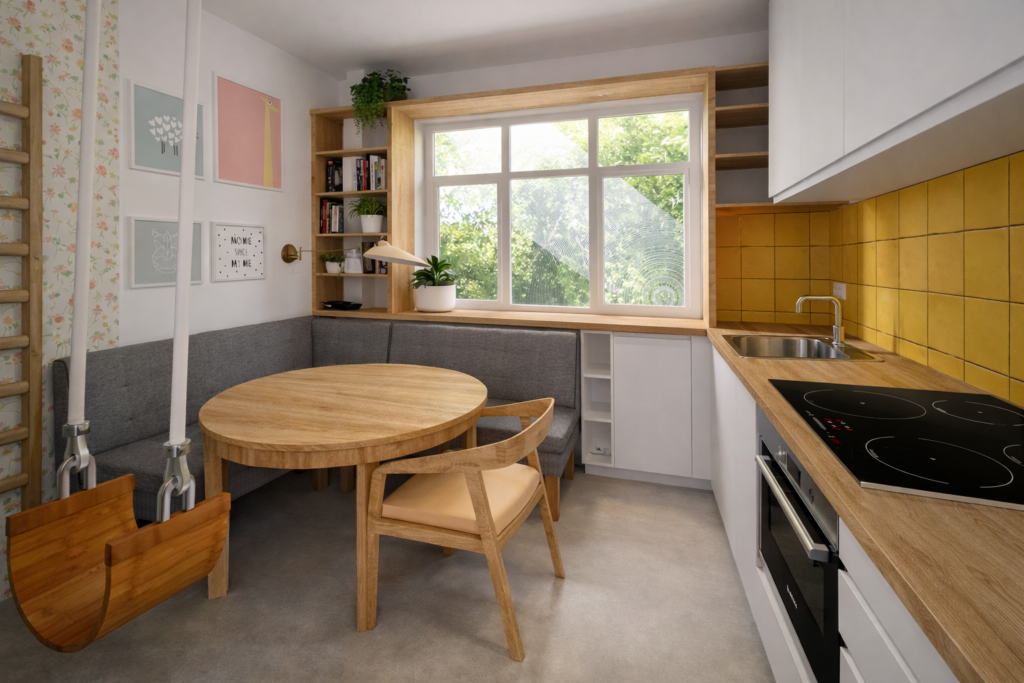 Veselý, útulný, barevný, malý, ale přesto plný možností a soukromých zákoutí pro každého člena domácnosti. Tak bych popsala společenský pokoj navržený pro mladou rodinu. Najdete zde novou kuchyňskou linku, jídelní kout až pro šest osob, vyvýšenou postel pro příležitostné hosty i útulný koutek pod ní s pohodlným ušákem, množstvím polštářů a čalouněným obložením.