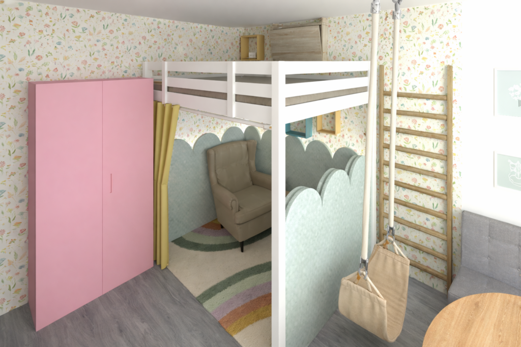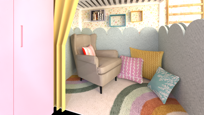 Barevná koncepce vychází z jemné pastelové tapety s květinovým motivem. V prostoru vynikají žluté obklady u kuchyňské linky, žlutý závěs tvořící pomyslnou oponu pod vyvýšenou postelí, růžová skříň a další barevné doplňky, které dohromady vytvářejí radostnou a živou atmosféru místnosti.